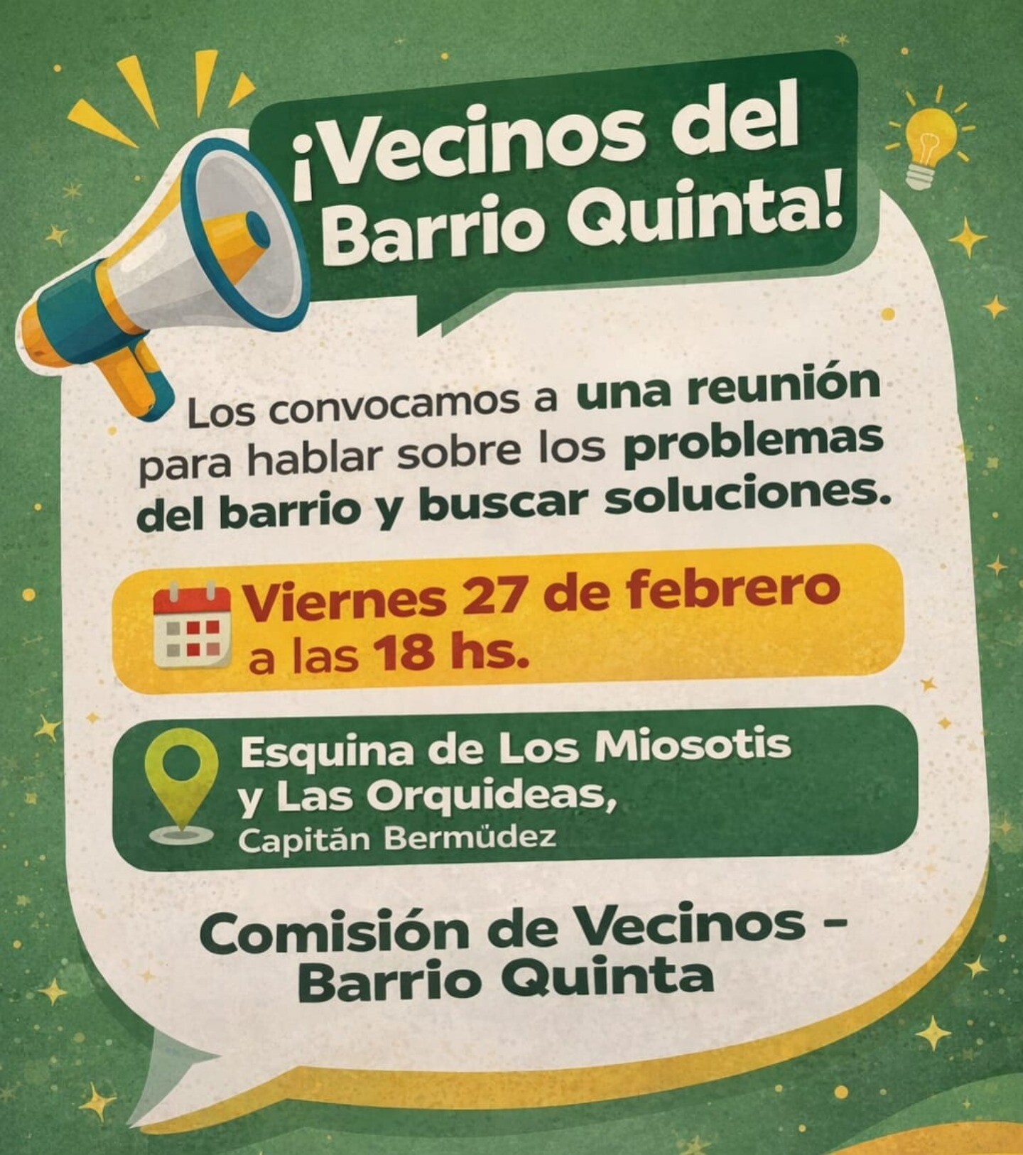 Vecinos de barrio Quinta están convocado a una reunión este viernes a las 18 horas en la esquina de calle Los Miosotis y Las Orquídeas para abordar distintas problemáticas que afectan a la barriada desde hace mucho tiempo y no tienen respuesta de las autoridades municipales.