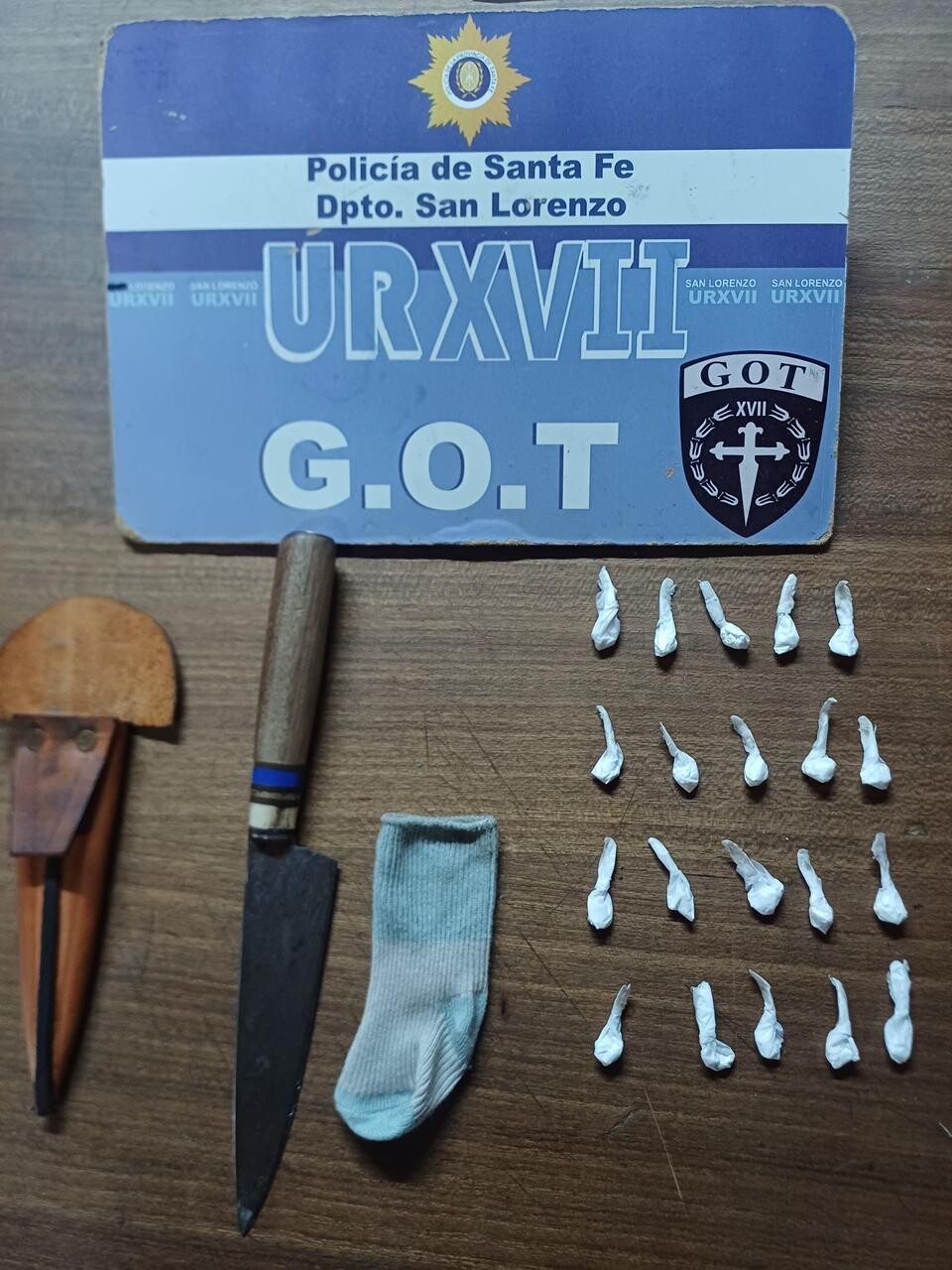 El hombre fue trasladado a sede policial hallandose  entre sus prendas de vestir un cuchillo y  una media que contenía en su interior veinte  envoltorios con sustancia de características similares a cocaína.