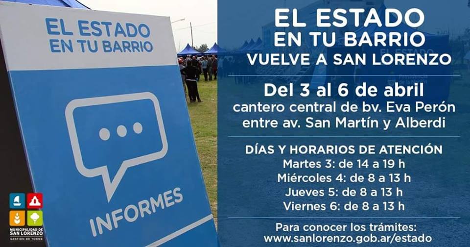El Estado en tu Barrio se hace presente en la ciudad de san Lorenzo desde el 3 al 6 de abril, se realizara de manera gratuita el DNI y sus actualizaciones  con entrega a domicilio en 15 días, cambio de domicilio.